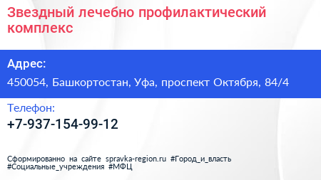 Звездный, лечебно-профилактический комплекс по адресу 450054, Башкортостан, Уфа, проспект Октября, 84/4 в дальнейшем Организация, размещена в следующих категориях: