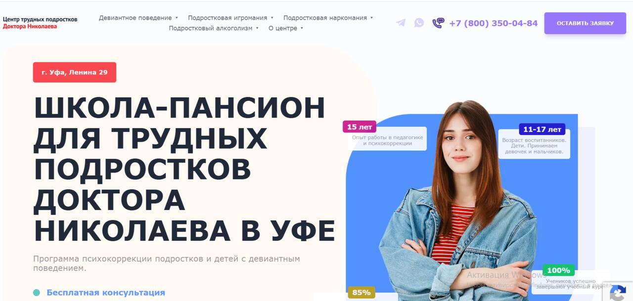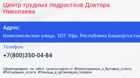 Центр трудных подростков Доктора Николаева по адресу Комсомольская улица, 107, Уфа, Республика Башкортостан в дальнейшем Организация, размещена в следующих категориях: