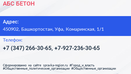 АБС БЕТОН по адресу 450902, Башкортостан, Уфа, Комаринская, 1/1 в дальнейшем Организация, размещена в следующих категориях: