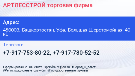 АРТЛЕССТРОЙ, торговая фирма по адресу 450003, Башкортостан, Уфа, Большая Шерстомойная, 40 к1 в дальнейшем Организация, размещена в следующих категориях:
