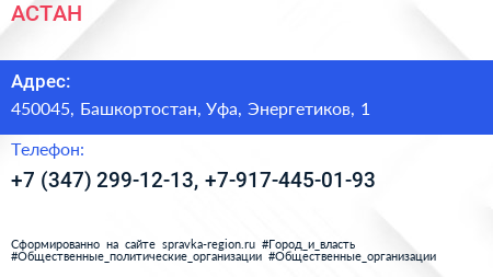 АСТАН по адресу 450045, Башкортостан, Уфа, Энергетиков, 1 в дальнейшем Организация, размещена в следующих категориях: