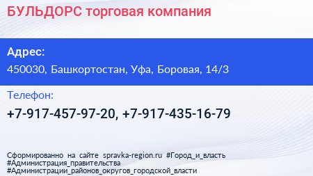 БУЛЬДОРС, торговая компания по адресу 450030, Башкортостан, Уфа, Боровая, 14/3 в дальнейшем Организация, размещена в следующих категориях: