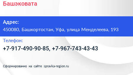 Башэковата по адресу 450080, Башкортостан, Уфа, улица Менделеева, 193 в дальнейшем Организация, размещена в следующих категориях: