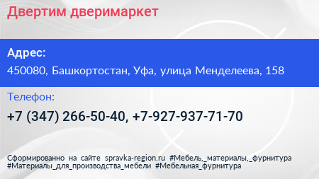 Двертим, дверимаркет по адресу 450080, Башкортостан, Уфа, улица Менделеева, 158 в дальнейшем Организация, размещена в следующих категориях: