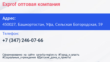 Exprof, оптовая компания по адресу 450027, Башкортостан, Уфа, Сельская Богородская, 59 в дальнейшем Организация, размещена в следующих категориях: