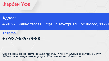 Фарбен Уфа по адресу 450027, Башкортостан, Уфа, Индустриальное шоссе, 112/1 в дальнейшем Организация, размещена в следующих категориях: