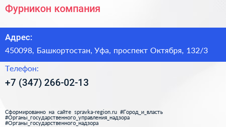 Для связи с организацией воспользуйтесь номером телефона: +7 (347) 266-02-13. Пн: c 10:00-18:00, Вт: c 10:00-18:00, Ср: c 10:00-18:00, Чт: c 10:00-18:00, Пт: c 10:00-18:00, Сб: выходной, Вс: выходной, вы можете обратиться в эту организацию.