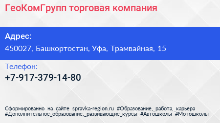 ГеоКомГрупп, торговая компания по адресу 450027, Башкортостан, Уфа, Трамвайная, 15 в дальнейшем Организация, размещена в следующих категориях: