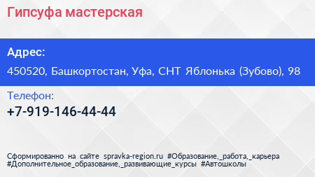 Гипсуфа, мастерская по адресу 450520, Башкортостан, Уфа, СНТ Яблонька (Зубово), 98 в дальнейшем Организация, размещена в следующих категориях: