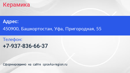Керамика по адресу 450900, Башкортостан, Уфа, Пригородная, 55 в дальнейшем Организация, размещена в следующих категориях: