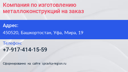 Компания по изготовлению металлоконструкций на заказ по адресу 450520, Башкортостан, Уфа, Мира, 19 в дальнейшем Организация, размещена в следующих категориях: