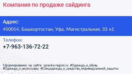 Компания по продаже сайдинга по адресу 450014, Башкортостан, Уфа, Магистральная, 33 к1 в дальнейшем Организация, размещена в следующих категориях:
