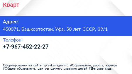 Кварт по адресу 450071, Башкортостан, Уфа, 50 лет СССР, 39/1 в дальнейшем Организация, размещена в следующих категориях:
