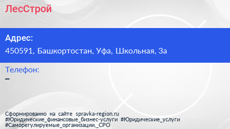 ЛесСтрой по адресу 450591, Башкортостан, Уфа, Школьная, 3а в дальнейшем Организация, размещена в следующих категориях: