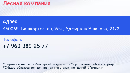 Лесная компания по адресу 450068, Башкортостан, Уфа, Адмирала Ушакова, 21/2 в дальнейшем Организация, размещена в следующих категориях: