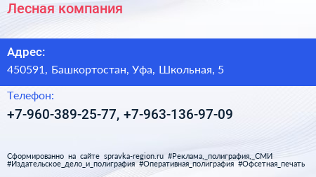 Лесная компания по адресу 450591, Башкортостан, Уфа, Школьная, 5 в дальнейшем Организация, размещена в следующих категориях: