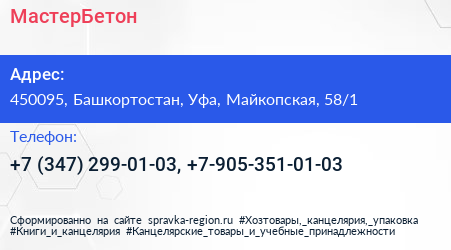 МастерБетон по адресу 450095, Башкортостан, Уфа, Майкопская, 58/1 в дальнейшем Организация, размещена в следующих категориях: