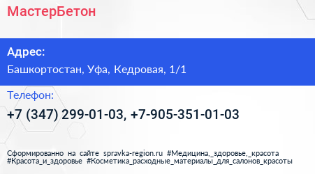 МастерБетон по адресу Башкортостан, Уфа, Кедровая, 1/1 в дальнейшем Организация, размещена в следующих категориях: