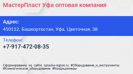 МастерПласт-Уфа, оптовая компания по адресу 450112, Башкортостан, Уфа, Цветочная, 38 в дальнейшем Организация, размещена в следующих категориях: