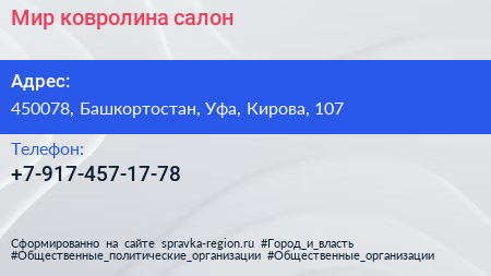 Мир ковролина, салон по адресу 450078, Башкортостан, Уфа, Кирова, 107 в дальнейшем Организация, размещена в следующих категориях: