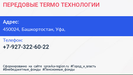 ПЕРЕДОВЫЕ TERMO ТЕХНОЛОГИИ по адресу 450024, Башкортостан, Уфа, в дальнейшем Организация, размещена в следующих категориях: