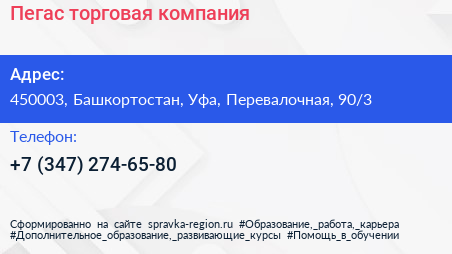 Пегас, торговая компания по адресу 450003, Башкортостан, Уфа, Перевалочная, 90/3 в дальнейшем Организация, размещена в следующих категориях: