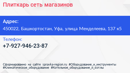 Плиткарь, сеть магазинов по адресу 450022, Башкортостан, Уфа, улица Менделеева, 137 к5 в дальнейшем Организация, размещена в следующих категориях: