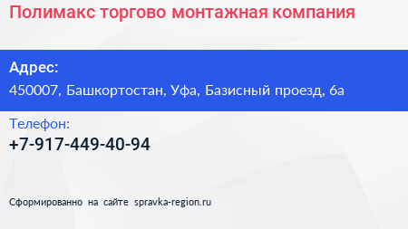 Полимакс, торгово-монтажная компания по адресу 450007, Башкортостан, Уфа, Базисный проезд, 6а в дальнейшем Организация, размещена в следующих категориях:
