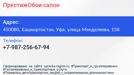ПрестижОбои, салон по адресу 450080, Башкортостан, Уфа, улица Менделеева, 158 в дальнейшем Организация, размещена в следующих категориях: