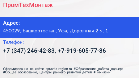 ПромТехМонтаж по адресу 450029, Башкортостан, Уфа, Дорожная 2-я, 1 в дальнейшем Организация, размещена в следующих категориях: