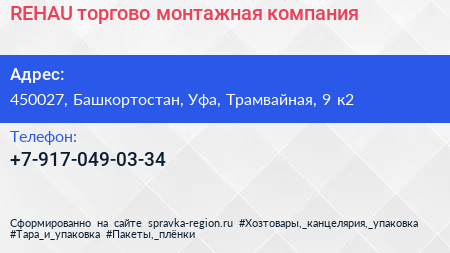 REHAU, торгово-монтажная компания по адресу 450027, Башкортостан, Уфа, Трамвайная, 9 к2 в дальнейшем Организация, размещена в следующих категориях: