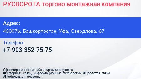 РУСВОРОТА, торгово-монтажная компания по адресу 450076, Башкортостан, Уфа, Свердлова, 67 в дальнейшем Организация, размещена в следующих категориях: