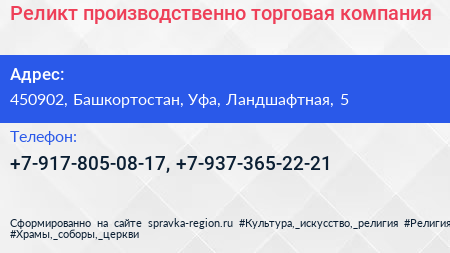 Реликт, производственно-торговая компания по адресу 450902, Башкортостан, Уфа, Ландшафтная, 5 в дальнейшем Организация, размещена в следующих категориях: