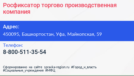 Росфиксатор, торгово-производственная компания по адресу 450095, Башкортостан, Уфа, Майкопская, 59 в дальнейшем Организация, размещена в следующих категориях: