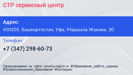 СТР, сервисный центр по адресу 450105, Башкортостан, Уфа, Маршала Жукова, 20 в дальнейшем Организация, размещена в следующих категориях: