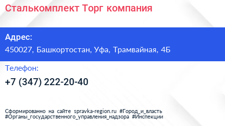 Сталькомплект-Торг, компания по адресу 450027, Башкортостан, Уфа, Трамвайная, 4Б в дальнейшем Организация, размещена в следующих категориях: