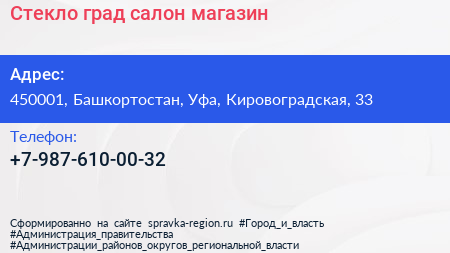 Стекло град, салон-магазин по адресу 450001, Башкортостан, Уфа, Кировоградская, 33 в дальнейшем Организация, размещена в следующих категориях: