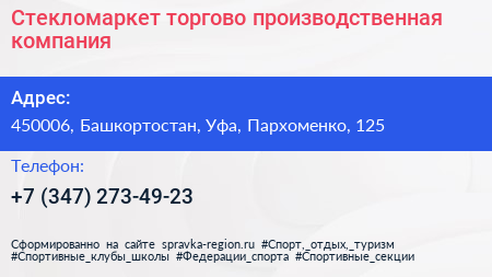 Стекломаркет, торгово-производственная компания по адресу 450006, Башкортостан, Уфа, Пархоменко, 125 в дальнейшем Организация, размещена в следующих категориях: