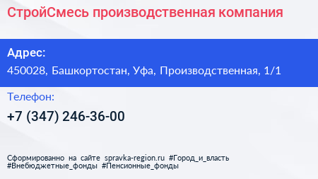 СтройСмесь, производственная компания по адресу 450028, Башкортостан, Уфа, Производственная, 1/1 в дальнейшем Организация, размещена в следующих категориях: