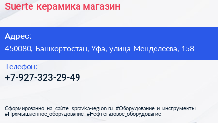 Suerte керамика, магазин по адресу 450080, Башкортостан, Уфа, улица Менделеева, 158 в дальнейшем Организация, размещена в следующих категориях: