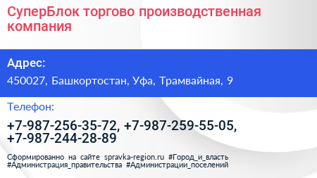 СуперБлок, торгово-производственная компания по адресу 450027, Башкортостан, Уфа, Трамвайная, 9 в дальнейшем Организация, размещена в следующих категориях: