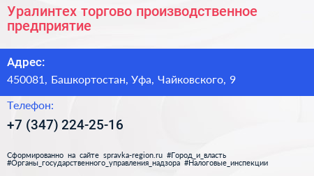 Уралинтех, торгово-производственное предприятие по адресу 450081, Башкортостан, Уфа, Чайковского, 9 в дальнейшем Организация, размещена в следующих категориях: