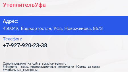 УтеплительУфа по адресу 450049, Башкортостан, Уфа, Новоженова, 86/3 в дальнейшем Организация, размещена в следующих категориях: