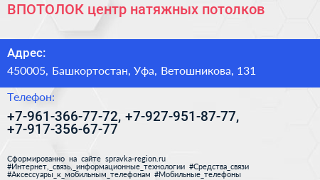 ВПОТОЛОК, центр натяжных потолков по адресу 450005, Башкортостан, Уфа, Ветошникова, 131 в дальнейшем Организация, размещена в следующих категориях: