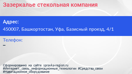 Зазеркалье, стекольная компания по адресу 450007, Башкортостан, Уфа, Базисный проезд, 4/1 в дальнейшем Организация, размещена в следующих категориях: