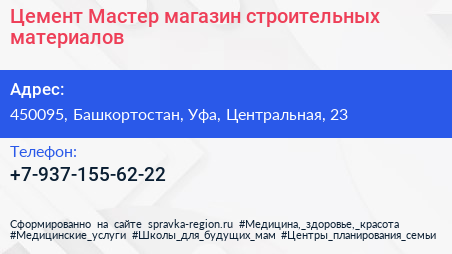 Цемент-Мастер, магазин строительных материалов по адресу 450095, Башкортостан, Уфа, Центральная, 23 в дальнейшем Организация, размещена в следующих категориях: