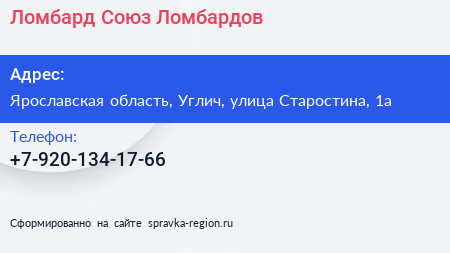 Ломбард Союз Ломбардов по адресу Ярославская область, Углич, улица Старостина, 1а в дальнейшем Организация, размещена в следующих категориях: