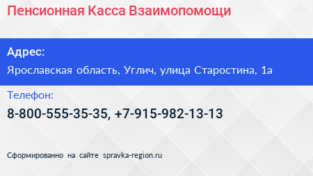 Пенсионная Касса Взаимопомощи по адресу Ярославская область, Углич, улица Старостина, 1а в дальнейшем Организация, размещена в следующих категориях: