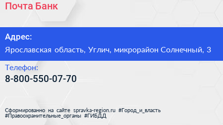 Почта Банк по адресу Ярославская область, Углич, микрорайон Солнечный, 3 в дальнейшем Организация, размещена в следующих категориях: