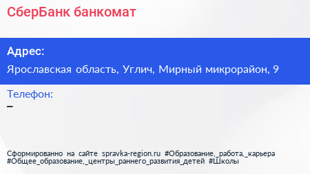 СберБанк, банкомат по адресу Ярославская область, Углич, Мирный микрорайон, 9 в дальнейшем Организация, размещена в следующих категориях: